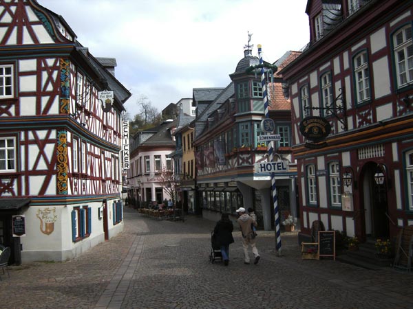 An der Kreuzung ging der Weg wirklich nach rechts und nach einer Viertelstunde hatte ich auf einem ziemlich morastigen Weg den Gipfel erreicht. Ich war nun bei 592 Meter Höhe angekommen. Hier oben traf ich auf ein Pärchen, der Sprache nach zwei Holländer. Ich fragte Sie wie der weitere Weg verlaufen würde. Sie meinten, dass es zwar ein wenig feucht sei, aber sonst ganz in Ordnung. „Müssen Sie noch weit?“ haben Sie mich gefragt. Als ich dann erklärte, dass ich in der Nähe wohne und nur für den Jakobsweg trainiere, fanden sie da ganz „doll“. „Wir sind zwar Protestanten, aber wir wollten schon immer Mal dahin“, sagte die Frau und wünschte mir einen noch einen schönen Tag. Das war auch mein Wunsch für sie und setzte meine Wege fort zum Tierpark Engenhahn. Hier angekommen führte der Wege weiter bergab. Leider verpasste ich den Aufstieg zum Roßberg. So ging ich ein Stück der Autobahn entlang und kam dann nach Idstein. Ich bin durch die Stadt gegangen und habe mich bewundert was sich seit meinem letzten Besuch sich verändert hat. Ich werde wohl dieses Jahr noch mal herkommen und mir die Stadt genauer ansehen. Kurz vor dem Stadtende kamen mir 3 Leute mit einem Becher Eis entgegen, dies war der Anlass für mich mich mit 3 Kugeln Eis zu belohnen.