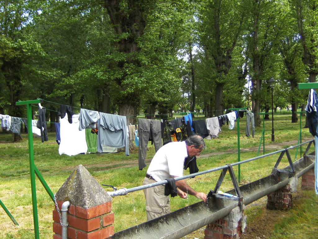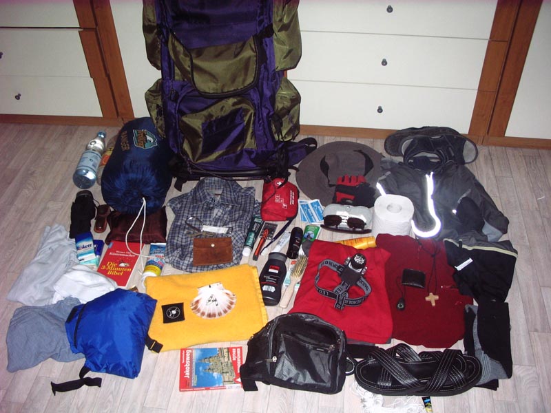 Morgens um 6:00 Uhr wird nach dem Aufstehen losgelaufen. Eine Tagesetappe sollte ungefähr 25 Kilometer betragen. Dies richtet sich nach den Herbergen. Herberge? Ja, ich will nicht in Hotels wohnen, sondern in den klassischen Herbergen nächtigen. Mit bis zu 100 anderen Leuten in einem Raum schlafen? Na und, beim Bergwandern schläft man ja auch im Matratzenlager. Wenn man in der Herberge ankommt holt man sich den Stempel in den Credencial. Anschließend ist Wäschewaschen angesagt, denn frische Wäsche für die 17 Tage würden das tragbare Gepäcklimit überschreiten. Da ich kein Packesel bin, habe ich als nur 2 Garnituren Unterwasche und Socken mit (eine zusätzliche als Reserve, falls die Wäsche mal nicht trocknet). 2 Wanderhosen, 1 Pulli, 2 Wanderhemden, 1 Shirt, 1 Jacke, 1 Regenjacke, 1 Paar Sandalen kommen zusammen mit dem Badetuch in den Rucksack. Ein Regenschirm, das oben genannte Cape, ein Erste-Hilfe-Set mit Blasenpflaster, Schlafsack und Toilettenartikel vervollständigen die Ausrüstung.