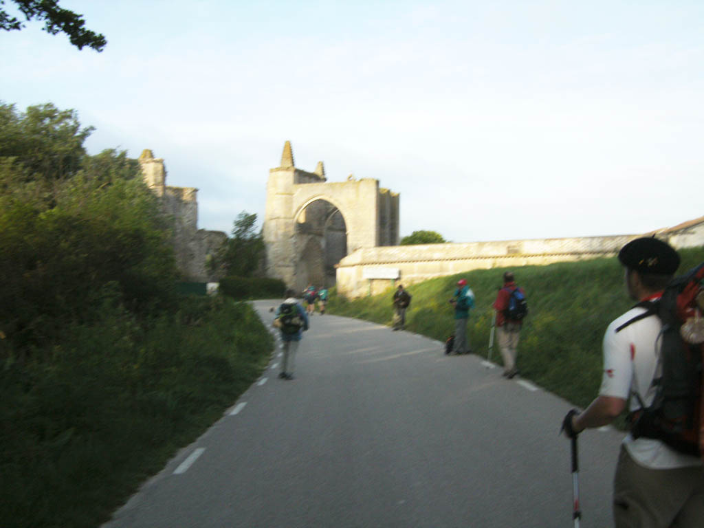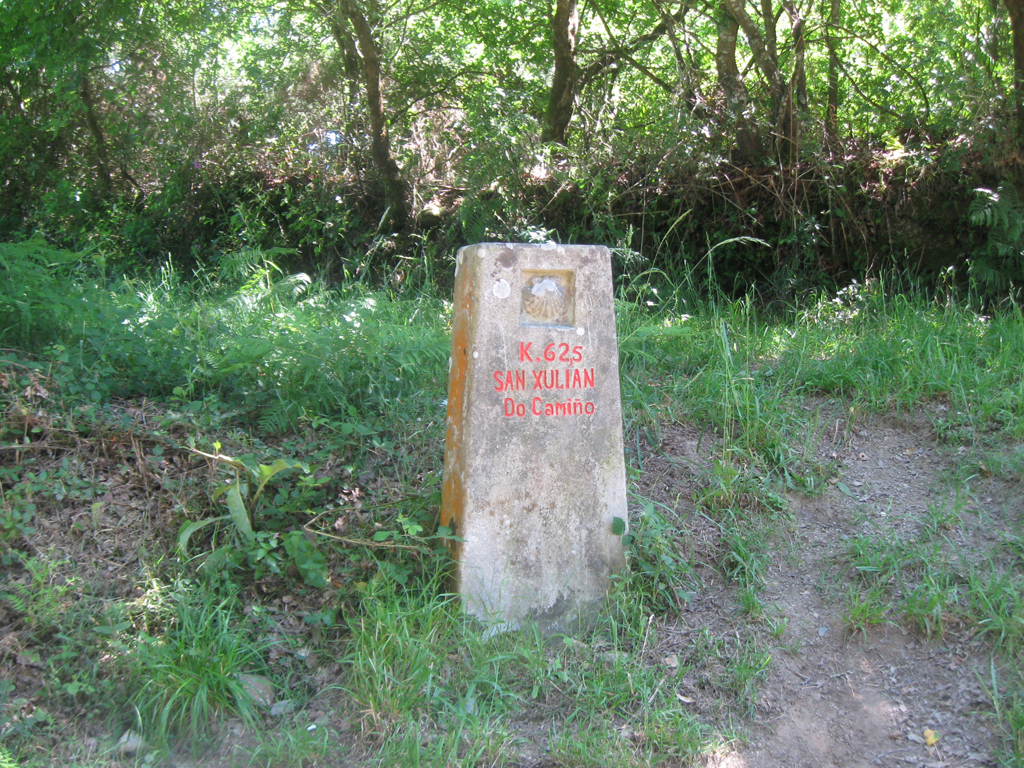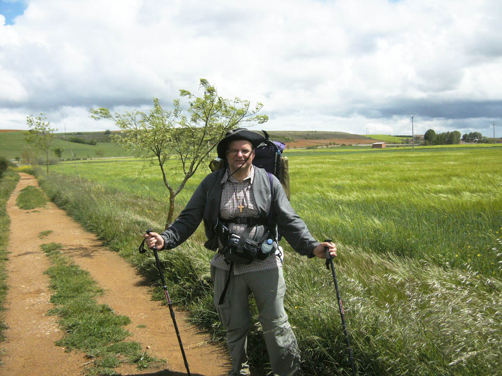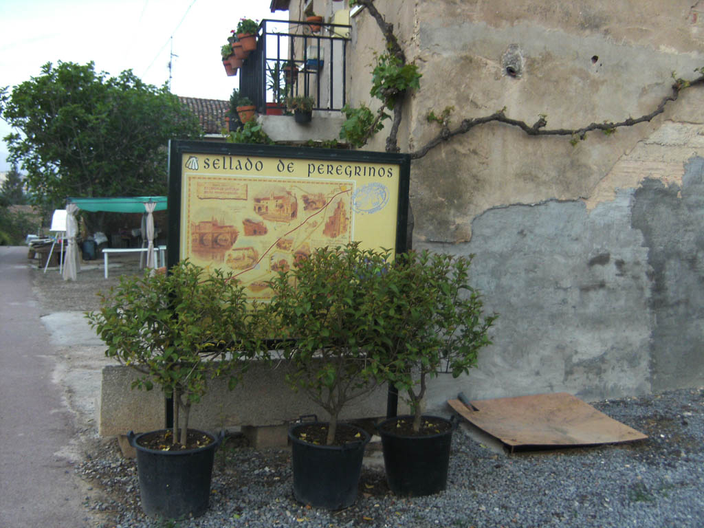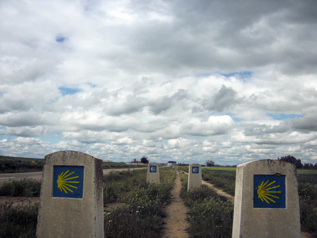 Als es unterwegs anfing zu regnen und ich meine Regenjacke auspacken wollte sagte John: „Was willst Du mit der Jacke, das bißchen Regen verdampft an unseren heißen Körpern“. An jeden Feldweg oder Straße wurde der Weg durch 2 Pfosten mit je einer Jakobsmuschelkachel getrennt. Man konnte teilweise mehr als fünfzig dieser Pfosten sehen. Als wir in