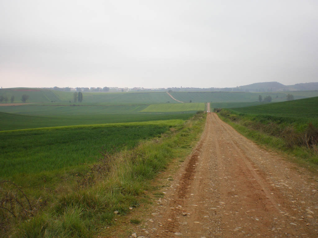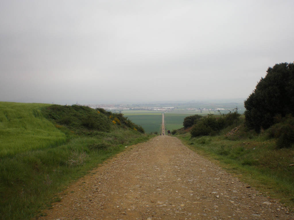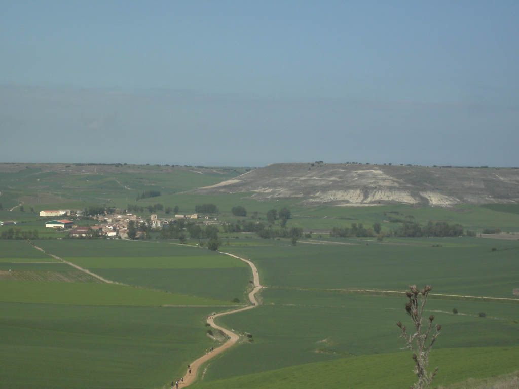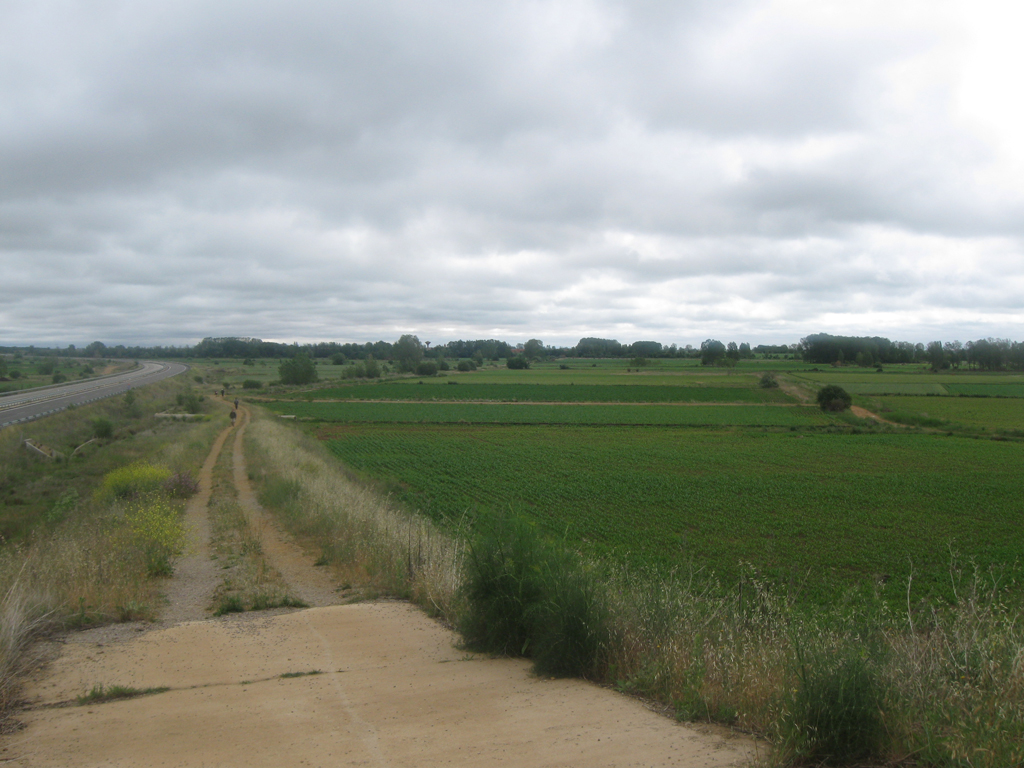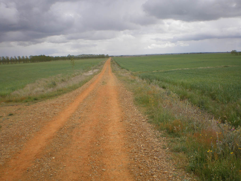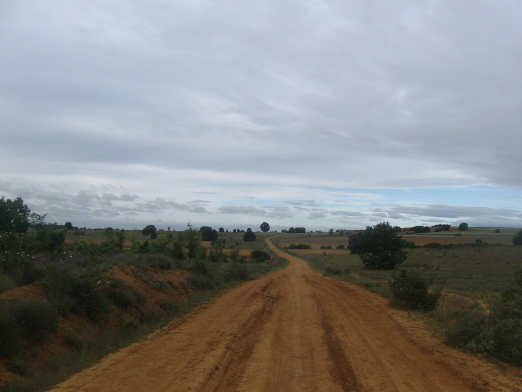 Hier nun ein Zitat aus dem Reiseführer: Rund 1/4 Std, nach der Abtei beginnt die Via Aquitana, die sich schnurgerade durch die fast baumlose, mit Getreidefeldern kultivierte Ebene zieht. Nach rund 21/4 Std. kommt endlich der Kirchturm des Friedhofes von Calzadilla de la Cueza in Sicht, doch bis dahin dauert es noch immer eine lange 3/4 Std.