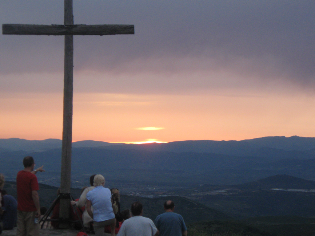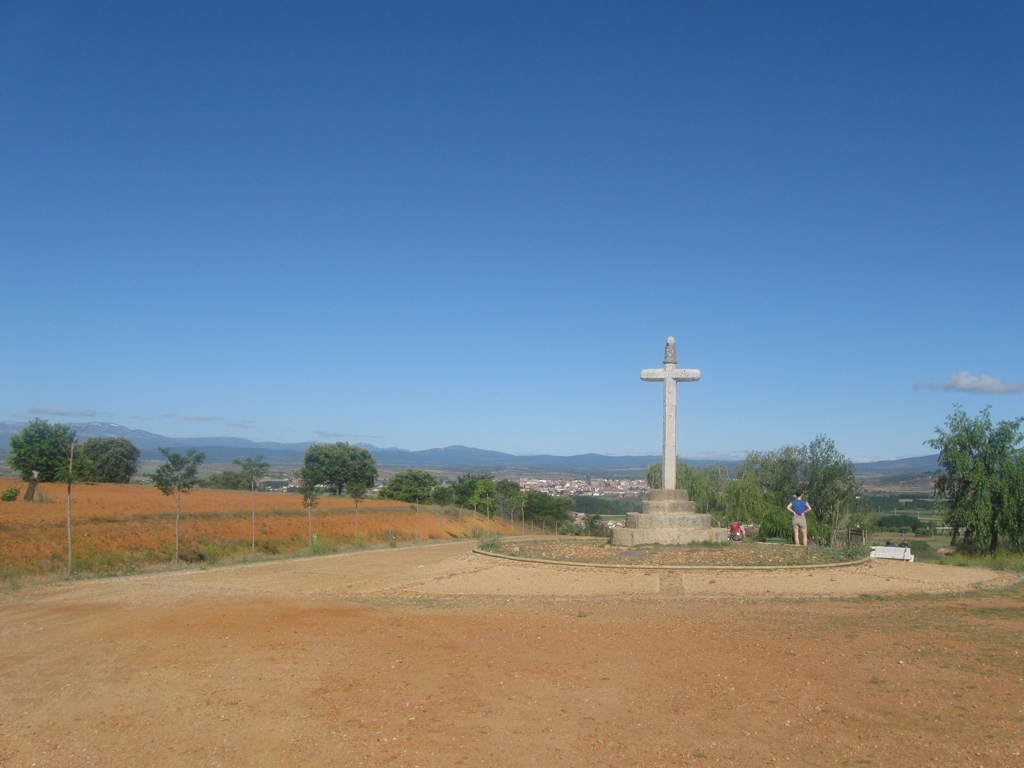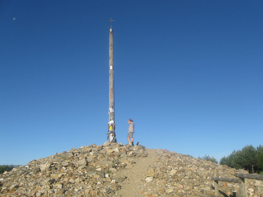 Steil nach oben ging der Weg zum Cruz de ferro. Um 6 .30 Uhr bin ich gestartet, da es heute 30º werden sollen. Die Höhe habe ich nach zwei Stunden erreicht und habe auch nach dem Eintreffen ein Halleluja gesungen. Meine Frauengruppe kam kurz später und dann haben wir oben beim Kreuz noch mal zusammen ein Halleluja gesungen.