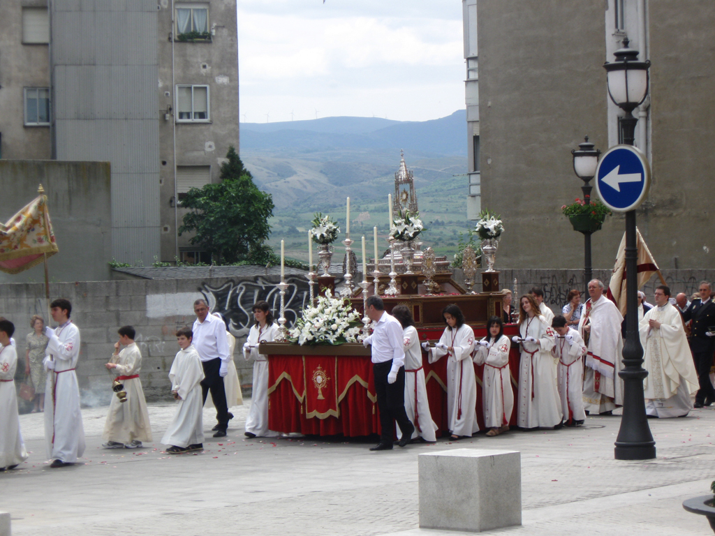 Von El Adebo ging der Weg teils steil ins Tal. Wir haben im ersten Dorf in der Ebene einen Kaffee genossen. Mit frischer Kraft ging es weiter nach Ponferada. Hier läuteten die Glocken, wir sind gleich zur Kathedrale gegangen und haben es noch in den Gottesdienst geschafft. Danach fand die Fronleichnamsprozession statt. Hier in Spanien heißt das Corpus Christi. Zuerst gingen Fahnenträger mit 4 Meter hohen Fahnen, danach eine Marienfigur auf einem silberen Podest, geschmückt mit mereren hundert weissen Rosen, getragen von mehr als 30 Männern. Das Orchester spielte tolle Musik. Es lief mit eiskalt den Rücken hinunter. Wir sind in der schweizer Herberge untergekommen. abends haben wir Waltrauds Geburtstag gefeiert.