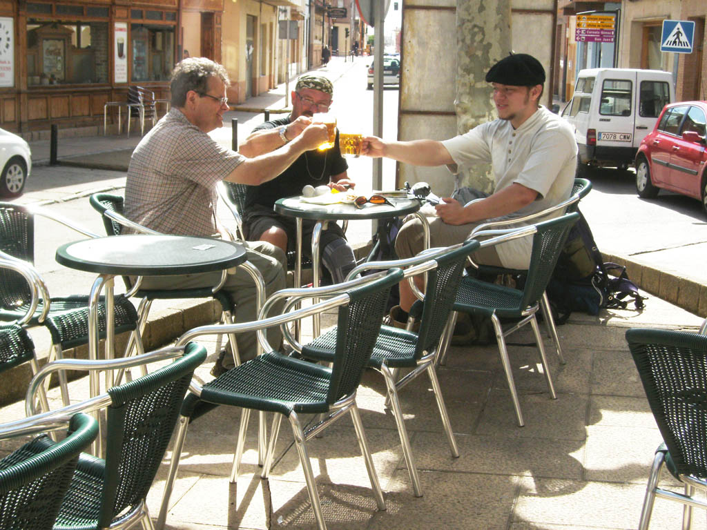 Wir setzten uns an eine Bar draußen in dies Sonne und tranken eine Runde Bier auf meinen Abschied. Es wurden dann insgesamt dreieinhalb Runden Bier. Zwischendurch kamen Andreas und andere Bekannte des Weges und verabschiedeten sich von mir. Ich kaufte Verpflegung für die Bahnreise ein und verabschiedete mich von Horst. John wollte heute nicht mehr weitergehen, so begleitete ich ihn zur Herberge wo er ein Bett neben Jim bekam. Ich hätte gerne noch einen Stempel in meinen Crendencial gemacht aber die gab es erst ab 15:00 Uhr.