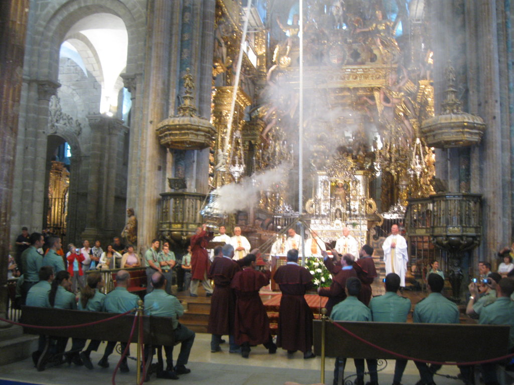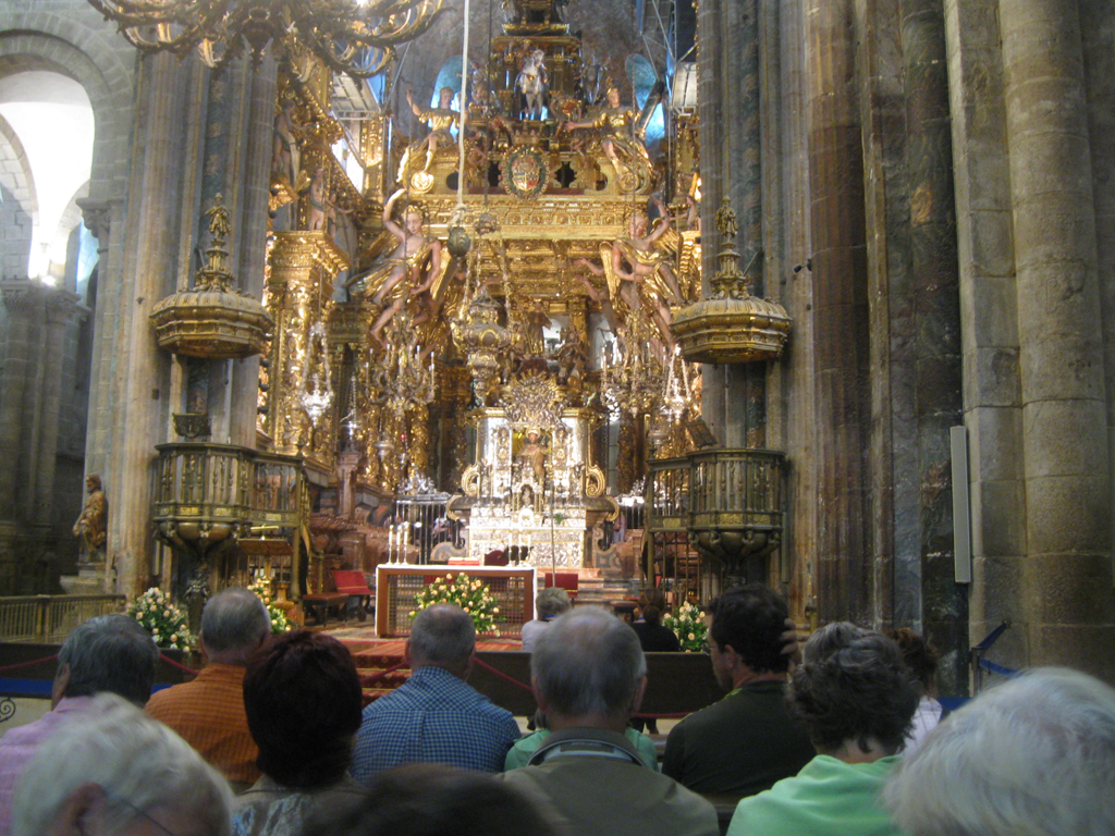 Santiago de Compostela wurde um 830 zum Wallfahrtsort, als man die in einem Grab gefundenen Gebeine dem Apostel Jakobus zuschrieb. In der eindrucksvollen Kathedrale schmückt ein vergoldete Baldachin den Altar. Ein ständiger Pilgerstrom bildet Schlangen, eine große Sitzfigur des hl. Jakobus wird als Zeichen der Ehrerbietung umarmt und geküsst.